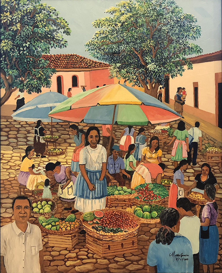 Mario Garcia currently lives in Grand Prairie, where he recreates scenes of his hometown in El Salvador, at the foot of a volcano covered in tropical foliage, where traditional village life persists, at least in the world his brilliantly-colored pointillist paintings evoke.