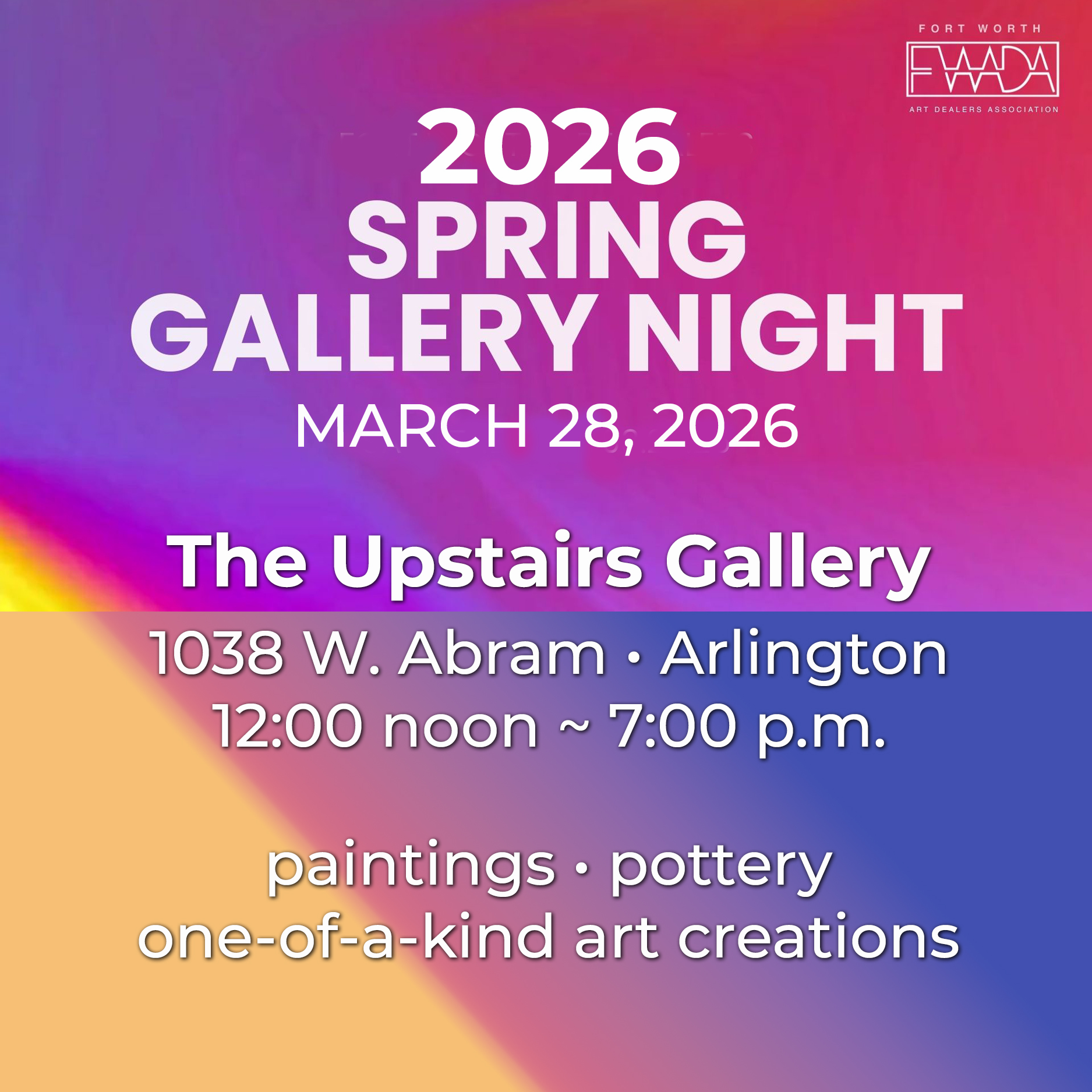 Founded in 1967 by Eleanor Grace Martin and her artist friends, The Upstairs Gallery has shared over 50 years of art with the Arlington, Texas community. We feature unique exhibitions, offer art classes enjoyed by thousands of adults and young people, and showcase the work of Arlington-area artists creating paintings, pottery, jewelry, and other original art.
