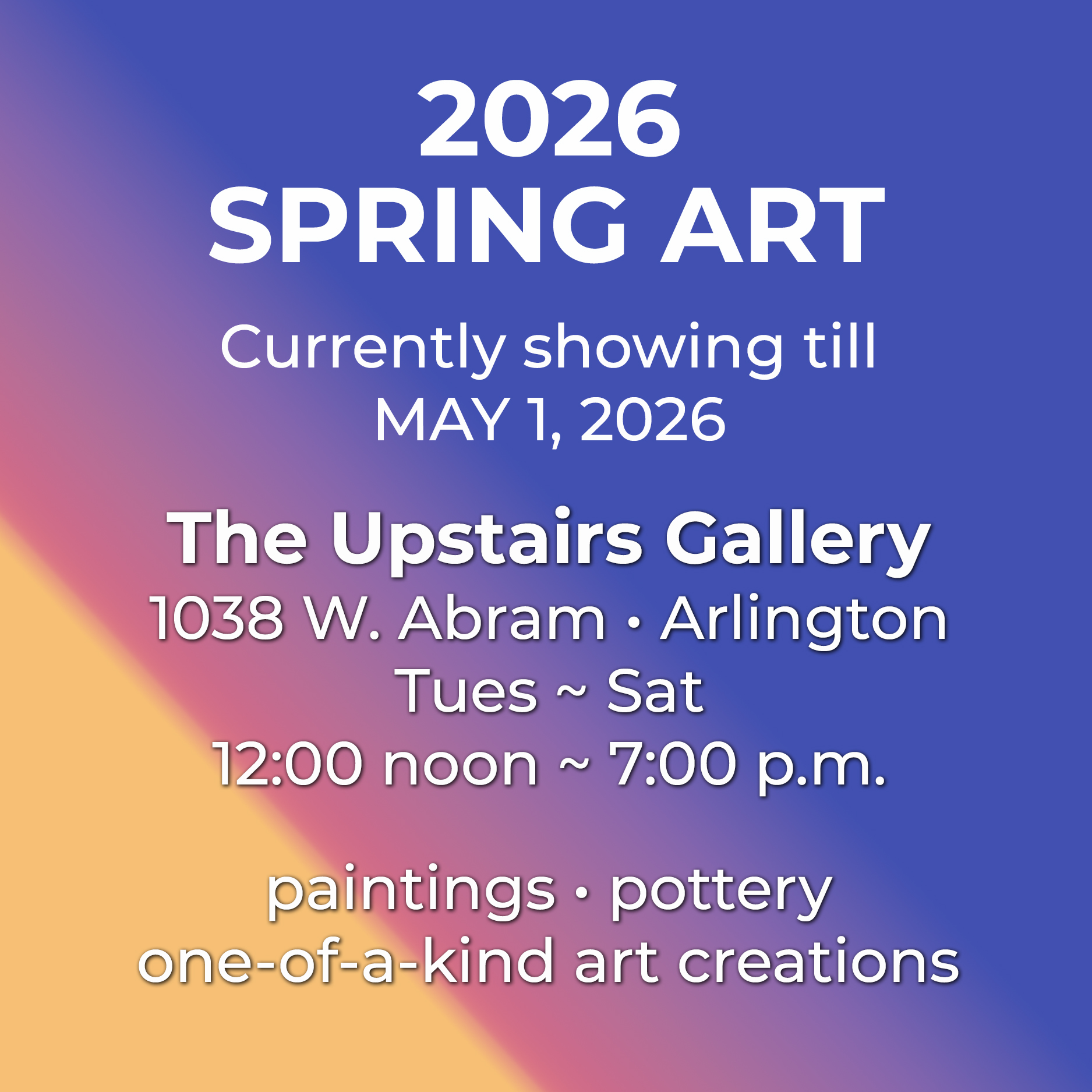 Founded in 1967 by Eleanor Grace Martin and her artist friends, The Upstairs Gallery has shared over 50 years of art with the Arlington, Texas community. We feature unique exhibitions, offer art classes enjoyed by thousands of adults and young people, and showcase the work of Arlington-area artists creating paintings, pottery, jewelry, and other original art.